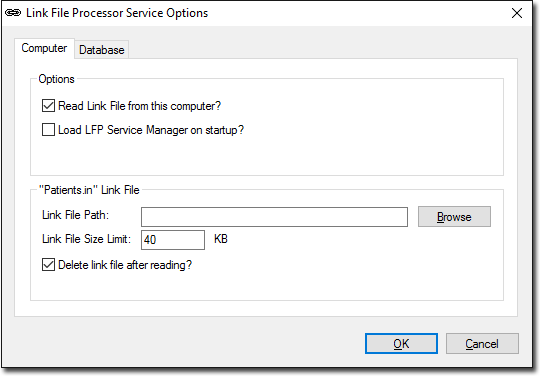 Click OK The Link File Processor Service Options window appears. Select the Computer tab. From this tab you will configure settings for the computer you are working at i.e. each computer can be configured differently.