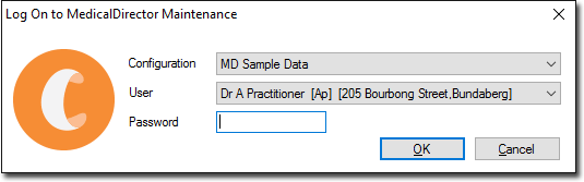You will be prompted select which database configuration you want to configure, and to enter your MedicalDirector User Name and password for the selected configuration. The configuration you select here should be the one you want to use the Link File Processor with.