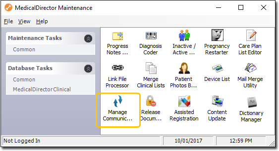 If this is the first time you have tried to run the Manage Communications utility during this session of working in MedicalDirector Maintenance, you will be prompted to select a Configuration, and enter your Username and Password.