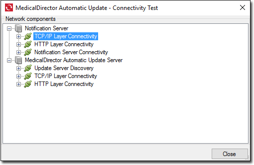 Before you first run MedicalDirector Automatic Update to update your installation of Pracsoft, or the MDref, it is advisable to conduct a connectivity test, which checks the Notification Server and MedicalDirector Automatic Update Server for connectivity, and if issues are discovered, displays them in the window presented to you. The Connectivity Test can be used thereafter as a troubleshooting tool, if required.