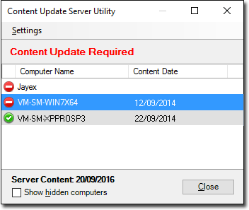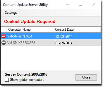 Show Hidden Computers check box You can hide a computer from the list within the Content Update Sever utility window by right-clicking the entry and selecting Hide Computer from the menu that appears. This check box displays hidden computers. Hidden computers are displayed in grey highlight, as shown in the following example.