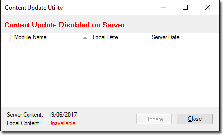 Settings menu > Disable Content Update This completely disables any content updates from being transferred to, or downloaded by, your workstation computers. If you were to access the Content Update utility from a workstation computer whilst this setting is enabled, the following window would indicate that updates have been disabled: