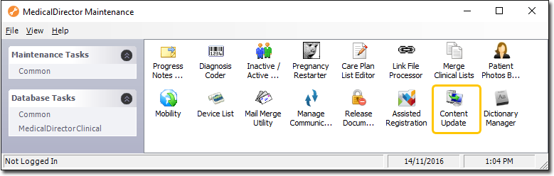 If this is the first time you have tried to run the Content Update utility during this session of working in MedicalDirector Maintenance, you will be prompted to select a Configuration, and enter your Username and Password. -