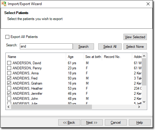 The Select Patients window is displayed. Enter a Search criteria for the file format. Click