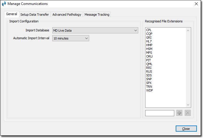 Clinical will then look for these files when importing Investigation Results. It is recommended that you do not delete any of the default extensions provided. These include SNP, CQP, CPL, MPS, QML, PIT, TRN, HMP, HL7, HSM, ORU, GRI, RUS, SDS and SPX.- To add a file extension, simply type the extension into the text box provided and then click