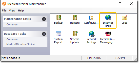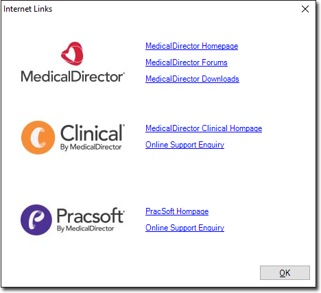 From within MedicalDirector Maintenance you can quickly access links to numerous MedicalDirector Corporate and product web pages.