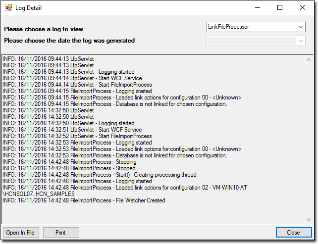 Click the button. The Log Detail window appears, with the Link File Processor log selected automatically.