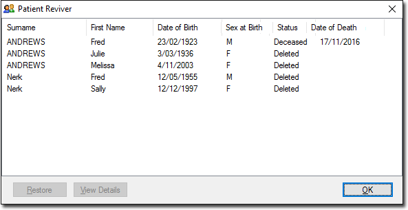 The Patient Reviver utility is provided as a mechanism for restoring patients that have previously been marked as Deceased or Deleted.