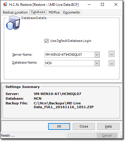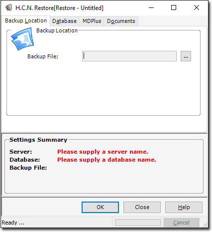 - Select the Backup Location tab. When you first open the Restore Utility, you are presented with a blank configuration, awaiting your input. Until you specify which backup file to restore, both the Server and Database fields are blank, waiting on input. These fields are populated automatically when you select a backup file to restore. Until you specify the backup file to restore, both the Database and Documents tabs are disabled. These tabs become active on selection of a backup file to restore.