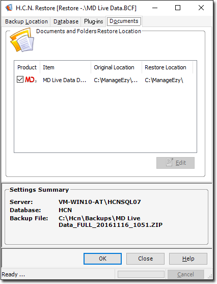 If you wish to restore this backup to your machine, the documents and letters configuration will need to be modified. For more information, refer to Configuring Documents Settings After Restoring. -