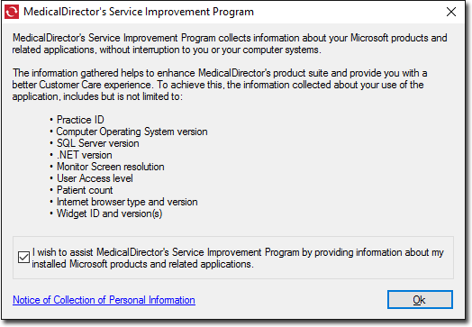 MedicalDirector's Service Improvement Program collections information about your Microsoft products and related applications, without interruption to you or your computer systems.