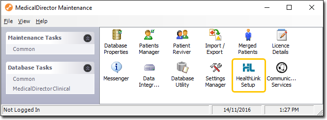 If this is the first time you have tried to access HealthLink Setup during this session of working in MedicalDirector Maintenance, you will be prompted to select a Configuration, and enter your Username and Password. The HealthLink Setup window appears.