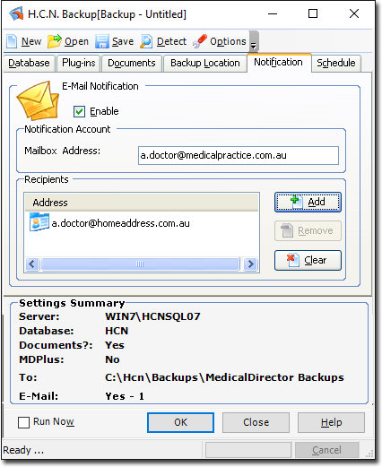 Simple Mail Transfer Protocol (SMTP), the de facto standard for e-mail transmissions across the Internet must be installed to have access to Backup Notification functionality. You will not be able to access the Notification tab if SMTP is not installed. If the SMTP Service is not installed you will be prompted accordingly upon opening the MedicalDirector Backup application.