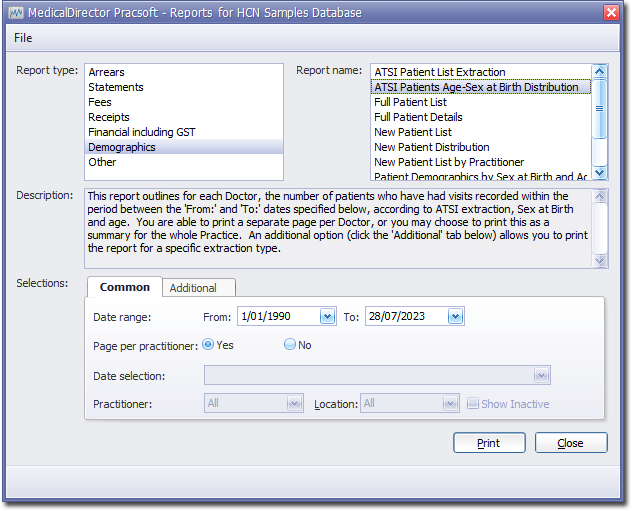 This report outlines for each practitioner, the number of patients who have had visits recorded within the period between the 'From:' and 'To:' dates specified below, according to ATSI extraction, sex at birth, and age. You are able to print a separate page per practitioner, or you may choose to print this as a summary for the whole Practice. An additional option (click the 'Additional' tab below) allows you to print the report for a specific extraction type.