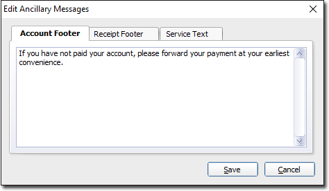 You can add pre-defined, customised messages to Account and Receipt footers, as explained below. Note that this window is also used for creating customised text that you can add to service items when recording visits.
