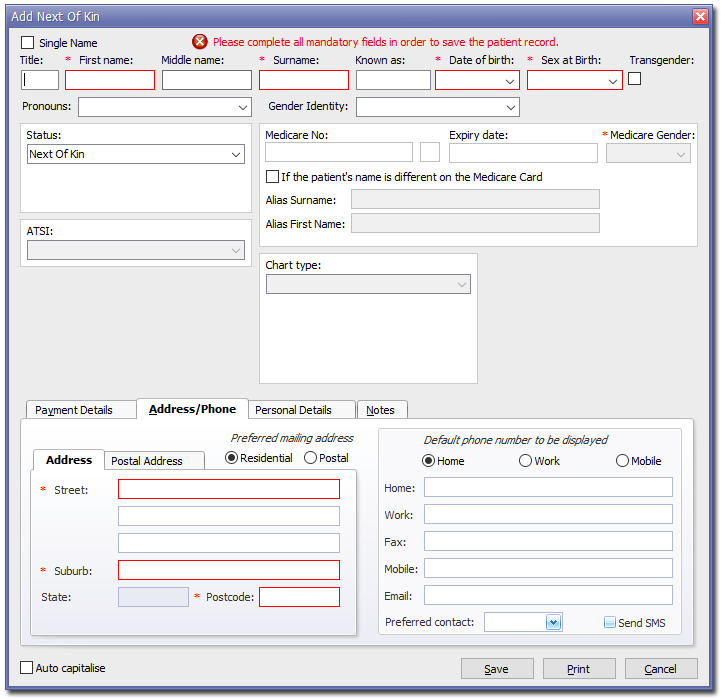 A 'Next-of-Kin' record is someone who acts as the next-of-kin for another patient in your database, but who themselves is not a patient in your database. If you have indicated that a person is thenext-of-kin for a patient, and then they themselves want to receive services as a patient at your Practice, you must change their status to either 'active' or 'visiting'. Once someone has visited your Practice as a patient, although they can continue to act as the next-of-kin for another patient, their status can no longer be switched back to simply 'next-of-kin'.