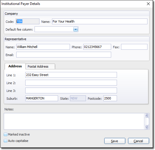 For institutional payers you may nominate the default fee columns that are charged.