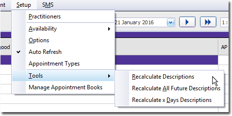 - Recalculate All Future Descriptions- replaces the description and added notes for all future linked patient appointments in the entire Pracsoft database. This may take some time, depending on the size of the database.
