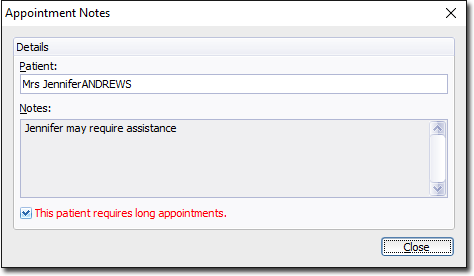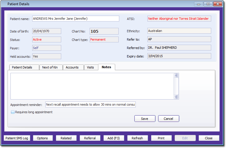 Pracsoft enables you to record permanent notes for a patient, that appear each time you schedule an appointment for them. This information is not recorded via the Appointment Book, but rather from within the patient's record, as explained below.