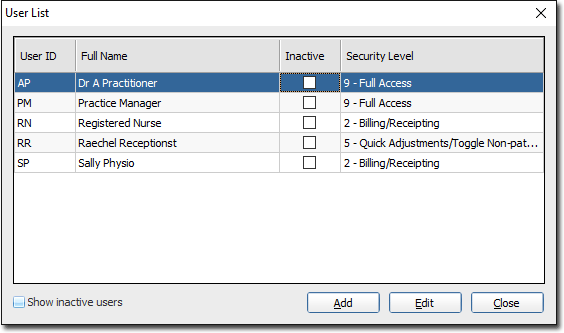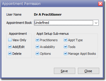 Appointment Permissions Before you beginTo configure appointment permissions for each user: Procedure Select Admin > User List. The User List window appears. Double-click the user you want to edit. The User Details widow appears. Click The Appointment Permission window appears. Indicate for Appointments in general, whether the user can; View > only (disables all other functionality) Add/Edit and/or Delete appointments Indicate which setup and sub-menu access the user has. Click to confirm your changes. Results