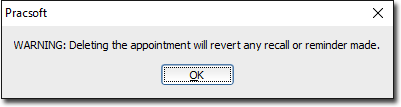 Click to delete the selected appointment from the Appointment Book itself. (optional) If the patient had intended to attend in relation to a recall recorded in Clinical, and you had flagged this when their appointment was originally scheduled, you will now be alerted to the fact that this flag will be reverted.