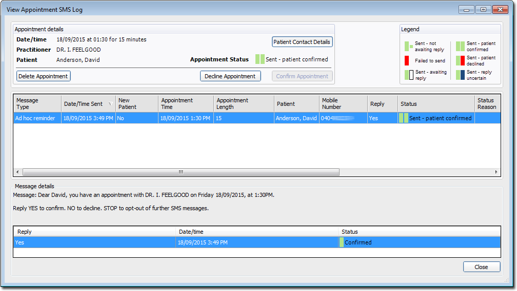 Then, use the log to optionally confirm, decline, or delete the appointment from this window. These changes are reflected in the Appointment Book itself. You may want to do this when;- The message failed to send (e.g. patient has opted-out, or the practice has run out of credits)