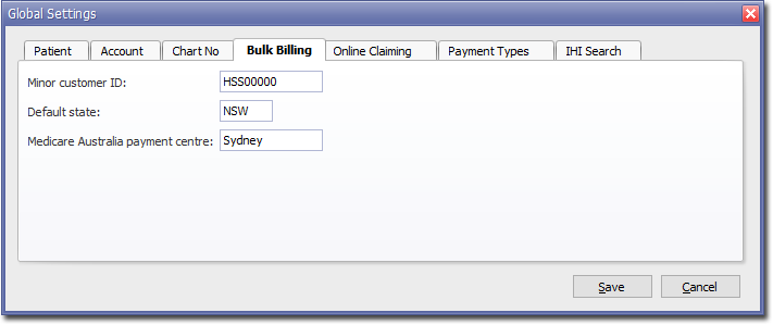 The Bulk Billing tab of Global Settings allows you to record Pracsoft's settings bulk billing. Settings modified here will affect all users.