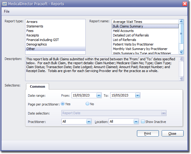 This report lists all Bulk Claims submitted within the period between the 'From:' and 'To:' dates specified below. For each Bulk Claim, the report details: Claim Number; Type; Claim Type; Claim Status; Transaction Date; Date Lodged; Amount Claimed; Amount Paid; Receipt Number; and Receipt Date. Totals are given for each Servicing Provider and for the practice as a whole.