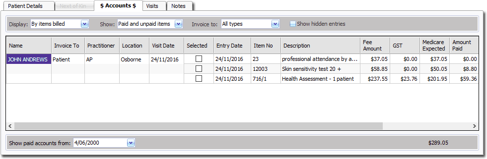 - The payment type will be changed and the payment amount will now appear in the patient's record with an asterisk (*) to indicate a change has been made. Double-clicking the amount will open a window which outlines details of when the receipted item was altered and the user who performed the alteration.