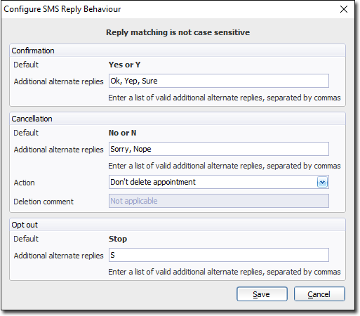 - The Appointment Book: From the Appointment Book you can send SMS messages to individual patients, or to multiple patients simultaneously. Because these SMS messages are being sent from the Appointment Book, it is assumed that the messages relate to the patients' appointments. When sending bulk SMS appointment reminders, in order to allow patients to confirm or reject their attendance at a scheduled appointment, Pracsoft accepts SMS replies from your patients, and then interprets-and-acts-upon those replies. For example, if a patient replies "No" to your appointment reminder, Pracsoft can be configured to automatically remove their appointment from the Appointment Book. The following information relates to configuring Pracsoft's acceptance of, and interpretation of, SMS reply messages sent by your patients.