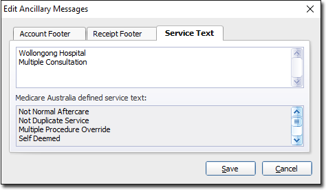 - The lower section of this window displays a list of pre-defined service text examples, approved by Medicare Australia.