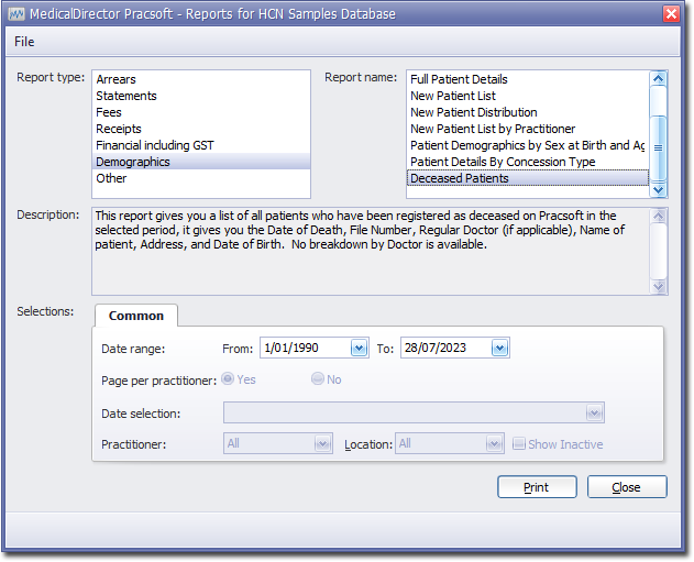 This report gives you a list of all patients who have been registered as deceased on Pracsoft in the selected period, it gives you the Date of Death, File Number, Regular Doctor (if applicable), Name of patient, Address, and Date of Birth. No breakdown by practitioner is available.