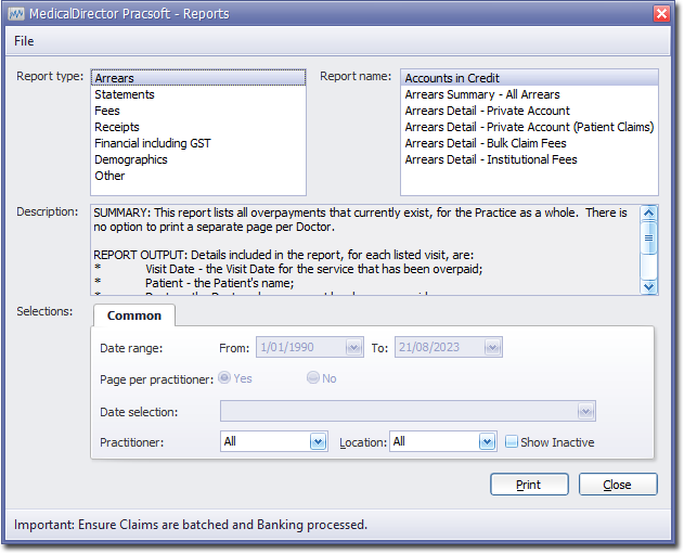 - (Optional) Specify criteria via the Selections section of the window. Most reports have selection criteria available on both the Common and Additional tabs criteria is also available on the associated tab.