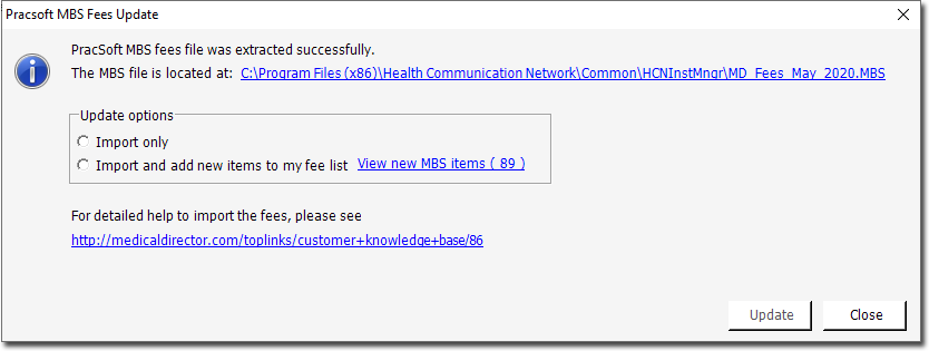 - Import and add new items to my fee list - your fees will be updated and all new items will be added to the list. To see which items will be added, click the View new MBS items link on the window.
