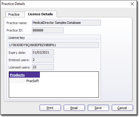 Pracsoft Licence Details Check your MedicalDirector Pracsoft licence details. Before you begin Note: This information is for reference only and cannot be edited here. About this taskView your Pracsoft licence details from the Practice details window. Procedure Select Setup > Practice Details. The Practice Details window is displayed. Select Licence Details tab. Results