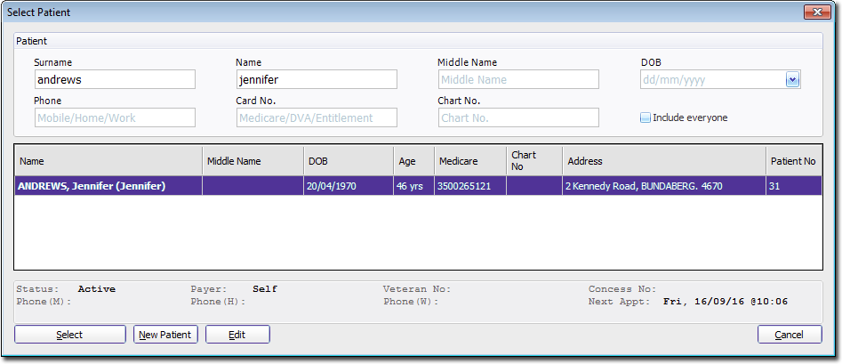 - Later when the patient arrives, you create a new record for them in Pracsoft, capturing all their details.