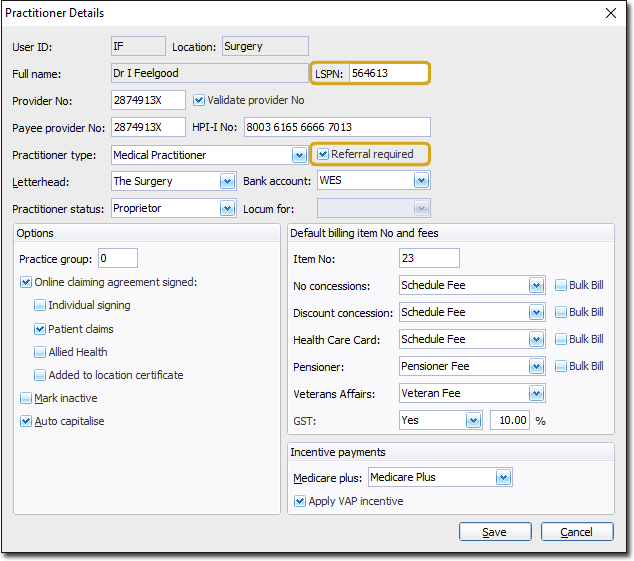 If you record an LSPN for a Practitioner, you must also tick the Referral Required check box. Failure to do so will result in your claims being rejected by Medicare.