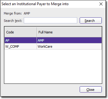 The Select an Institutional Payer to Merge Into window appears.