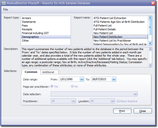 This report summarises the number of new patients added to the database in the period between the 'From:' and 'To:' dates specified below. It lists the number of new patients added in each month per calendar year, and also provides a total of the new patients added for the whole year. There are a number of additional options available with this report (click the 'Additional' tab below). You may specify: an age range; a postcode range; Sex at Birth; Active/Inactive/Deceased/Visiting Status; Concession type; any combination of these attributes; or none of these attributes.
