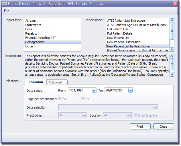 For each such patient, the report details: Servicing Doctor; Patient Surname; Patient First name; and Patient Date of Birth. It also provides a total number of patients for each practitioner, and for the practice as a whole. There are a number of additional options available with this report (click the 'Additional' tab below). You may specify: an age range; a post code range; Sex at Birth; Active/Inactive/Deceased/Visiting Status; Concession type; any combination of these attributes; or none of these attributes.