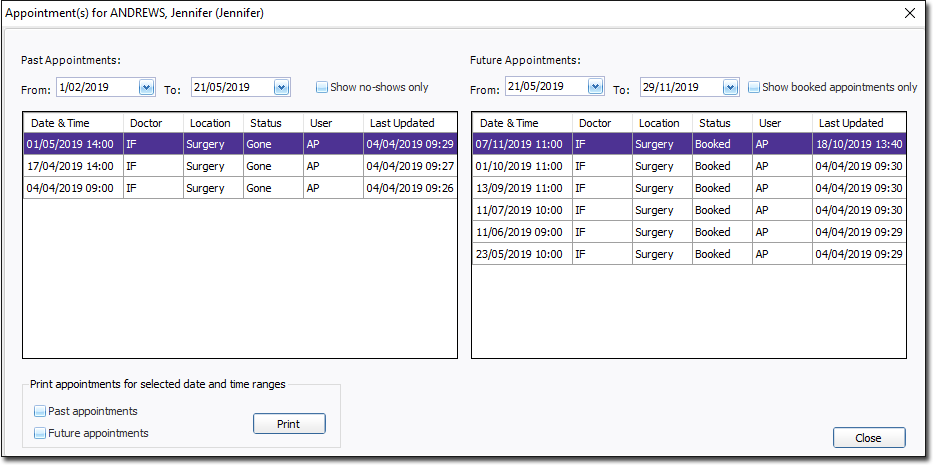 The appointments for the selected patient are displayed.- Settings in the window are retained for the active session.