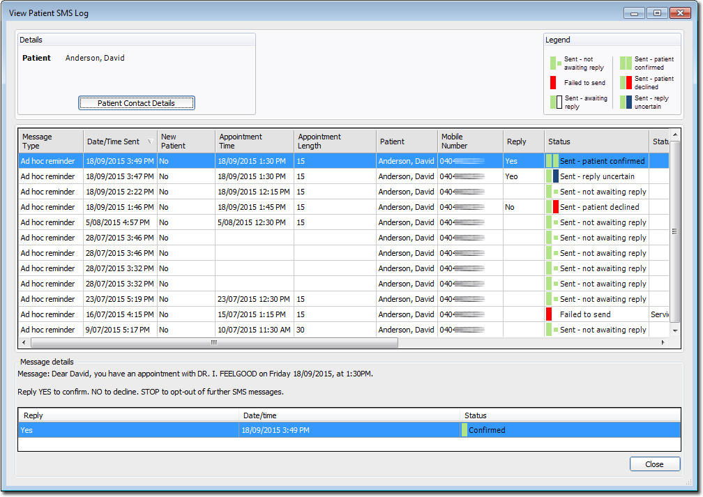 Date/Time Sent The date/time on which the SMS message was sent. New Patient Indicates whether the patient is a "new" patient i.e. they were entered directly into the Appointment Book before their record was created in Pracsoft. Reply Indicates whether a reply has been received. Patients can only reply if you have indicated they may. See SMS Message Status Tracking, and Patient Replies for more information. Accepted responses include;