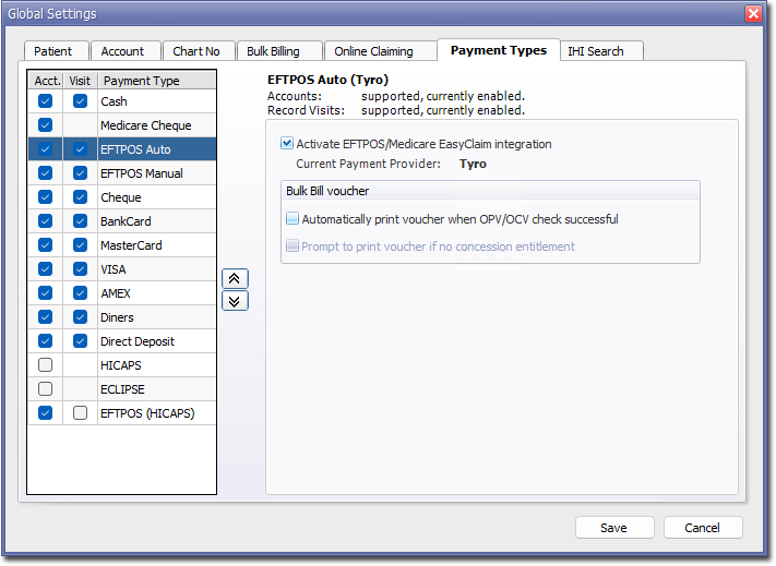 When Recording a Visit you must indicate the payment made, and in some cases the details of the payment type in order to issue a receipt. Payment types are managed via the Payment Types tab of Global Settings.