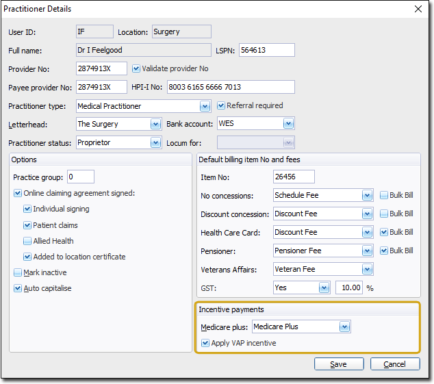 Within the Incentive Payments section indicate which Medicare Plus scheme the practitioner wantes to apply. You can also indicate whether to apply the VAP incentive (Veterans' Affairs Payment) for this practitioner by ticking the associated check box.