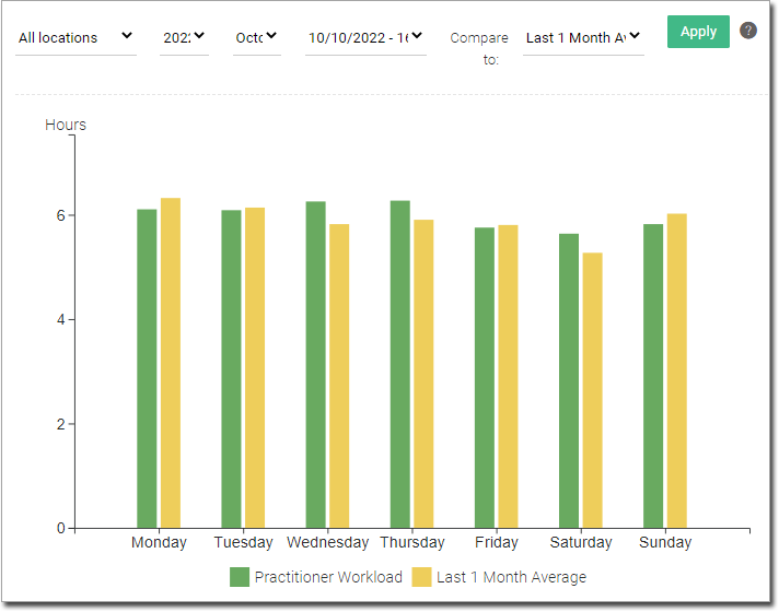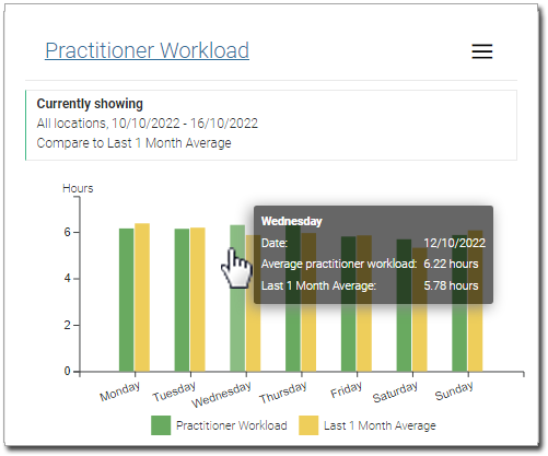 Each day displayed is benchmarked against the practice's past data for that day of the week using 1, 3, 6, 12 or 24-month historic averages. Hover over a column to view data on the practitioner workload for that day (averaged across all practitioners) with the corresponding average workload for that day of the week (calculated across the time period selected).