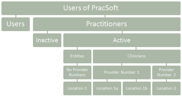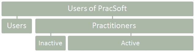 Practitioner accounts are then divided into two groups; 'Inactive' and 'Active'. An inactive practitioner is a clinician who does not intend to bill patients for services. For example, you may have a clinician who is registered in Clinical, but who will never bill patients for services in Pracsoft. This would be an unusual case, but Pracsoft provides for this type of user, regardless.