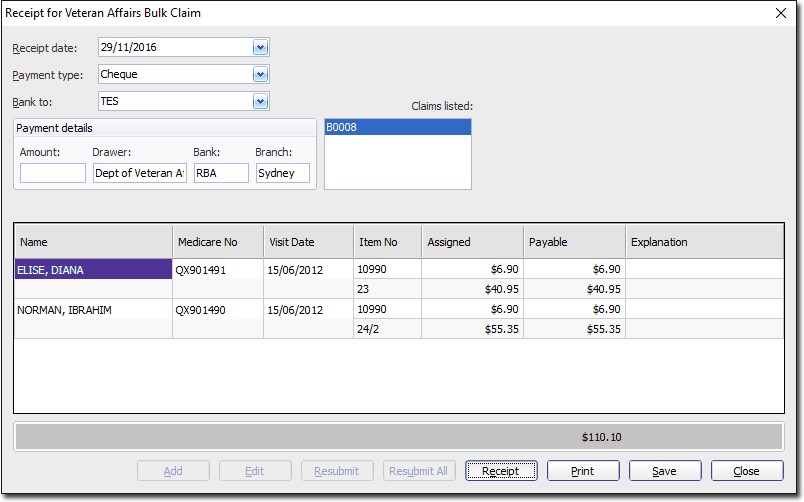 The Receipt for Bulk Claims window appears.