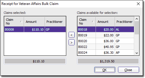- Ensure that the claim you want to print to is in the Claims Selected list on the left-hand side of this window. Claims can be moved from side to side by either double-clicking them, or selecting them and clicking the < and > arrows.