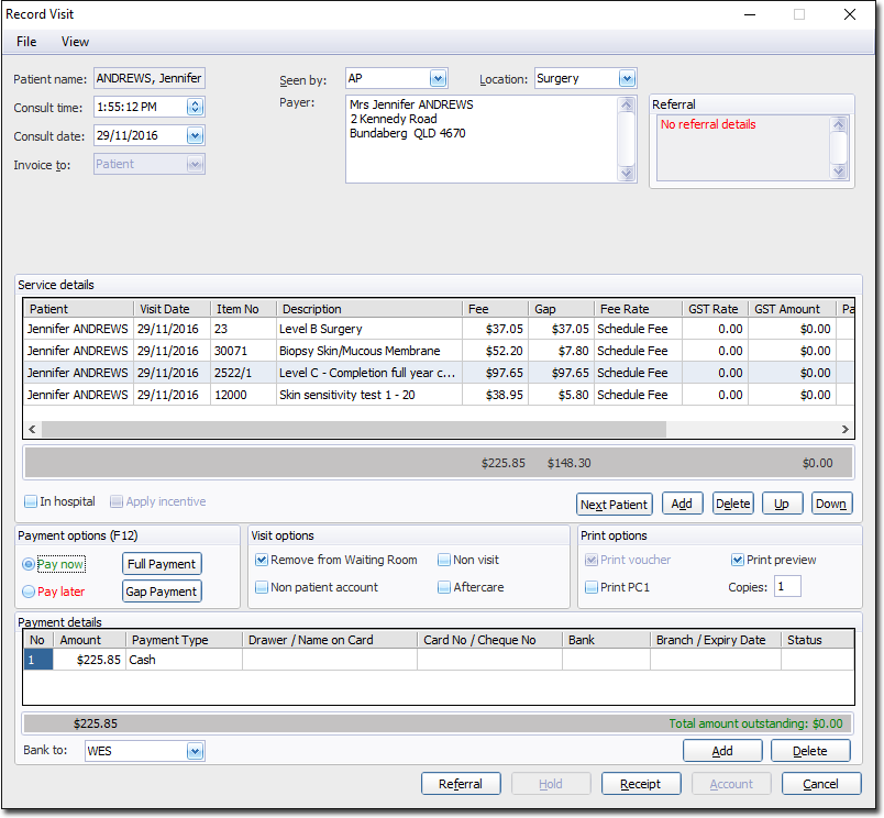 The first patient from those you selected in Step 2 appears in the Record Visit window, as shown above. Record their visit as you would a single patient, private account.