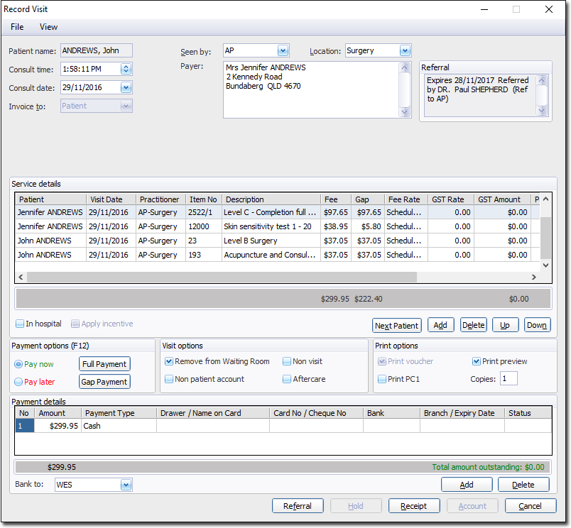 Record their visit as you would a single patient, private account. Notice in the following example how John Andrews is the second patient, but both his and Jennifer's service details have been recorded in the same window. John has even been seen by a different practitioner. This process assumes that for each patient, you are billing them for a single visit. However, you may want to indicate that a given patient is being billed for multiple service items over multiple visits. To indicate a different visit date for the current patient, select (or press Ctrl+N). A date field is added to the window, allowing you to manually specify the visit date.